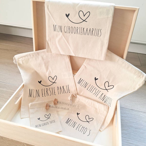 De kist is gepersonaliseerd met de naam en de geboortedatum van het kindje. Binnenin zitten 6 bewaarzakjes en 2 glazen bewaarbuisjes om die mooie herinneringen in te bewaren.
